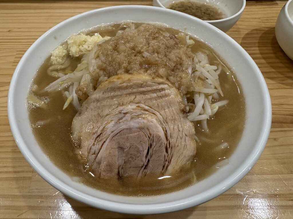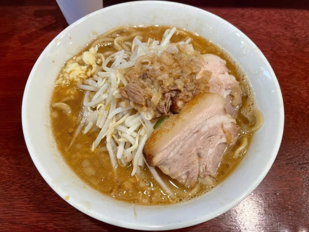 個人的には麺がいい感じでした。二郎系の太麺としてしっかり存在感がありつつ、スープとの相性も良い。